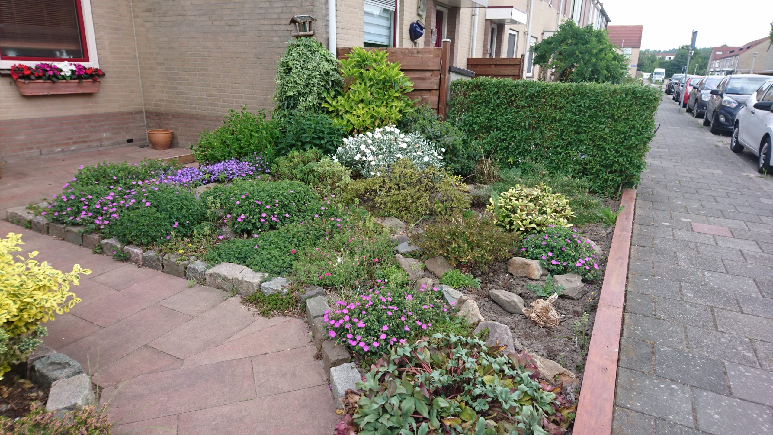 Wat heb je liever? Een straat waarin je puft van de hitte als de zon schijnt en waar de tegelterrassen overstromen als er regen valt? Of wat meer groen in de wijk met bloemen, vlinders en vogels? In een tuin is altijd iets nieuws te zien. Een stukje natuur is gemakkelijk te maken en daar hoef je echt geen groene vingers voor te hebben. Gewoon een paar tegels uit je tuin halen en daar een paar vaste planten in zetten, die al gauw de hele aarde begroeien en ervoor zorgen dat je bijna geen ‘onkruid’ in je tuin krijgt. Echt niet moeilijk. Het mooie is dat deze planten zelf voor hun water zorgen als de wortels maar groot kunnen worden. Dat heb je niet met planten in bakken en potten, die moet je de hele zomer water blijven geven.