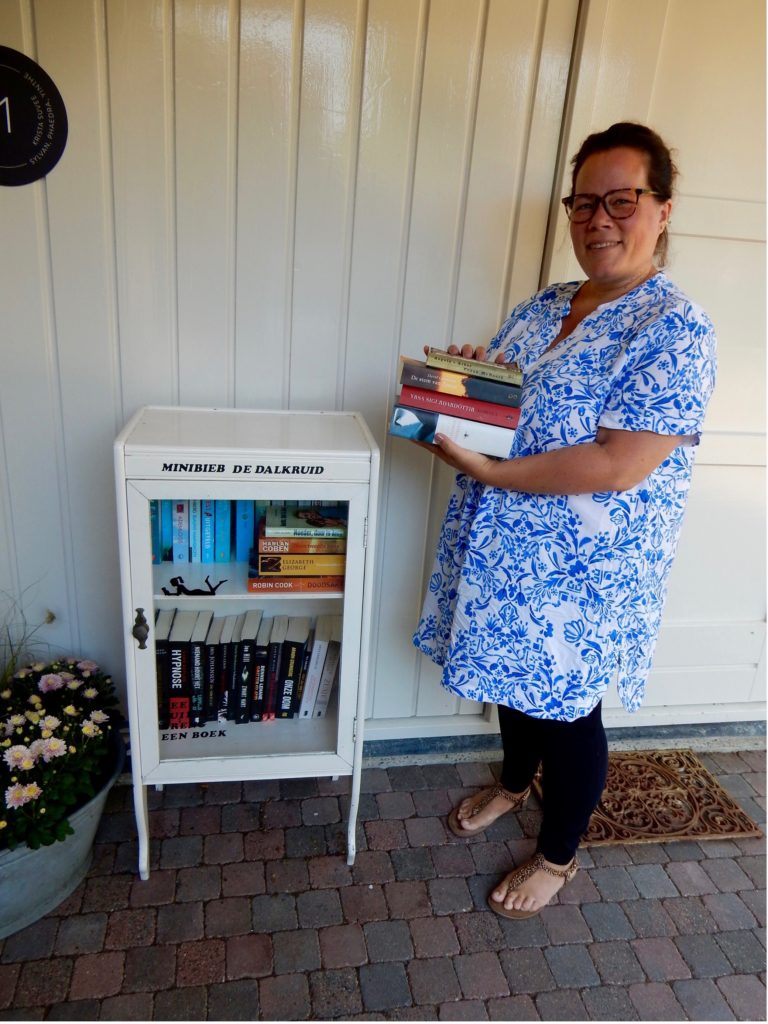 Toen Krista Suvee 20 jaar geleden in Almere kwam wonen, wilde ze pertinent in Kruidenwijk wonen. Eerst heeft ze in de Zuringstraat gewoond, sindsdien woont ze in de Dalkruidstraat. Zij had wel eens over boekenkastjes in Zeeland en in het Oosten van het land gelezen. Ze leest zelf ook graag boeken en wat doe je met boeken die je uit hebt??? Door middel van een boekenkast kan je iemand anders blij maken met een boek. Sinds mei 2016 verzorgt ze Minibieb De Dalkruidstraat.