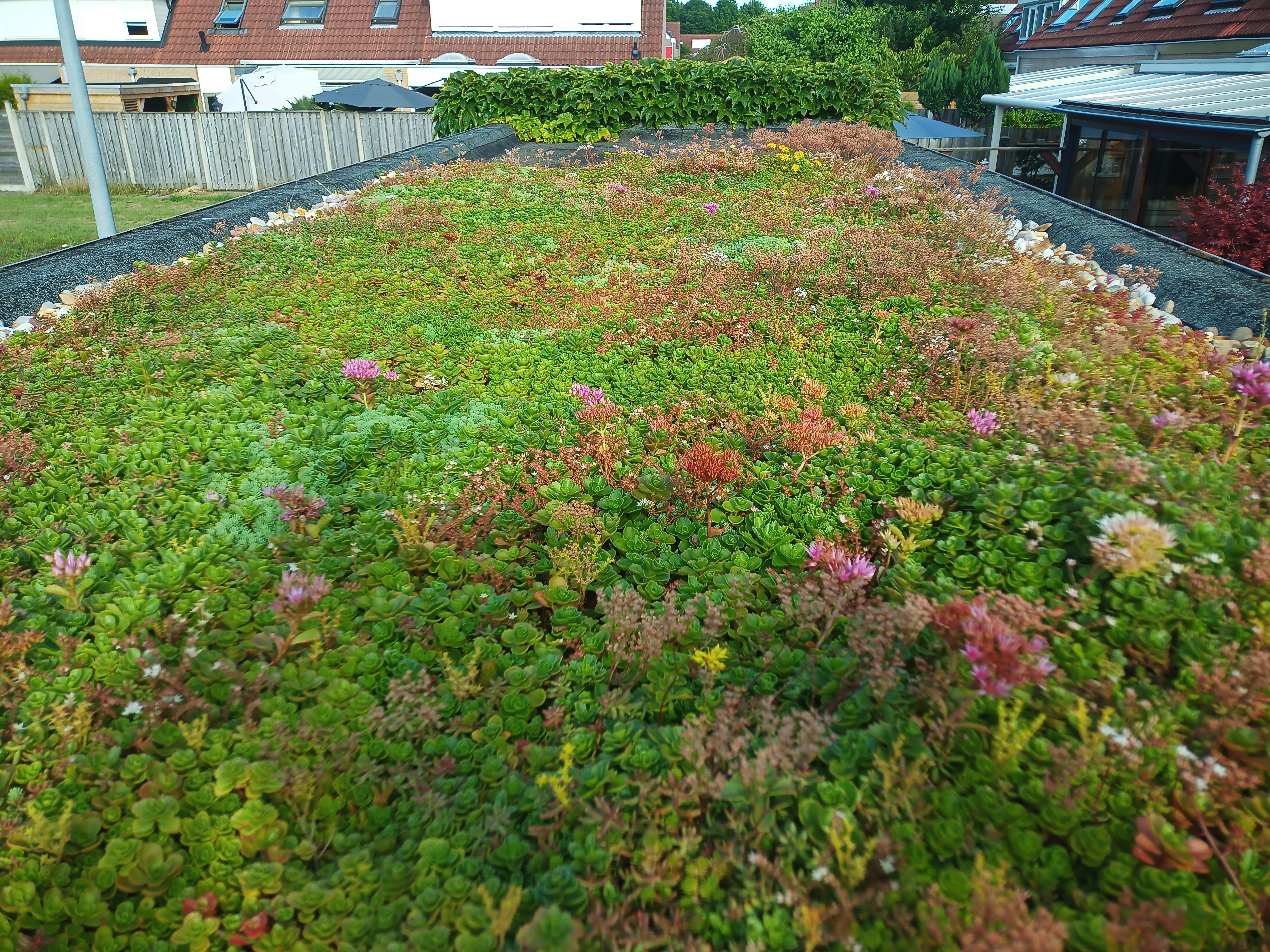 Het aantal platte daken in Almere is gelijk aan 80 voetbalvelden. Dat is maar liefst 540.000m2 aan plat dak in de stad. Heel veel potentie dus om onze omgeving nog meer te vergroenen. Een groen dak heeft vele voordelen. Het zorgt voor verkoeling in de ruimte er onder, het dak houdt geen warmte vast om het vervolgens ’s nachts af te geven. Het dak houdt water vast, is goed voor de biodiversiteit en ziet er ook nog eens mooi uit. Een groen dak verlengt de levensduur van je dak aanzienlijk.