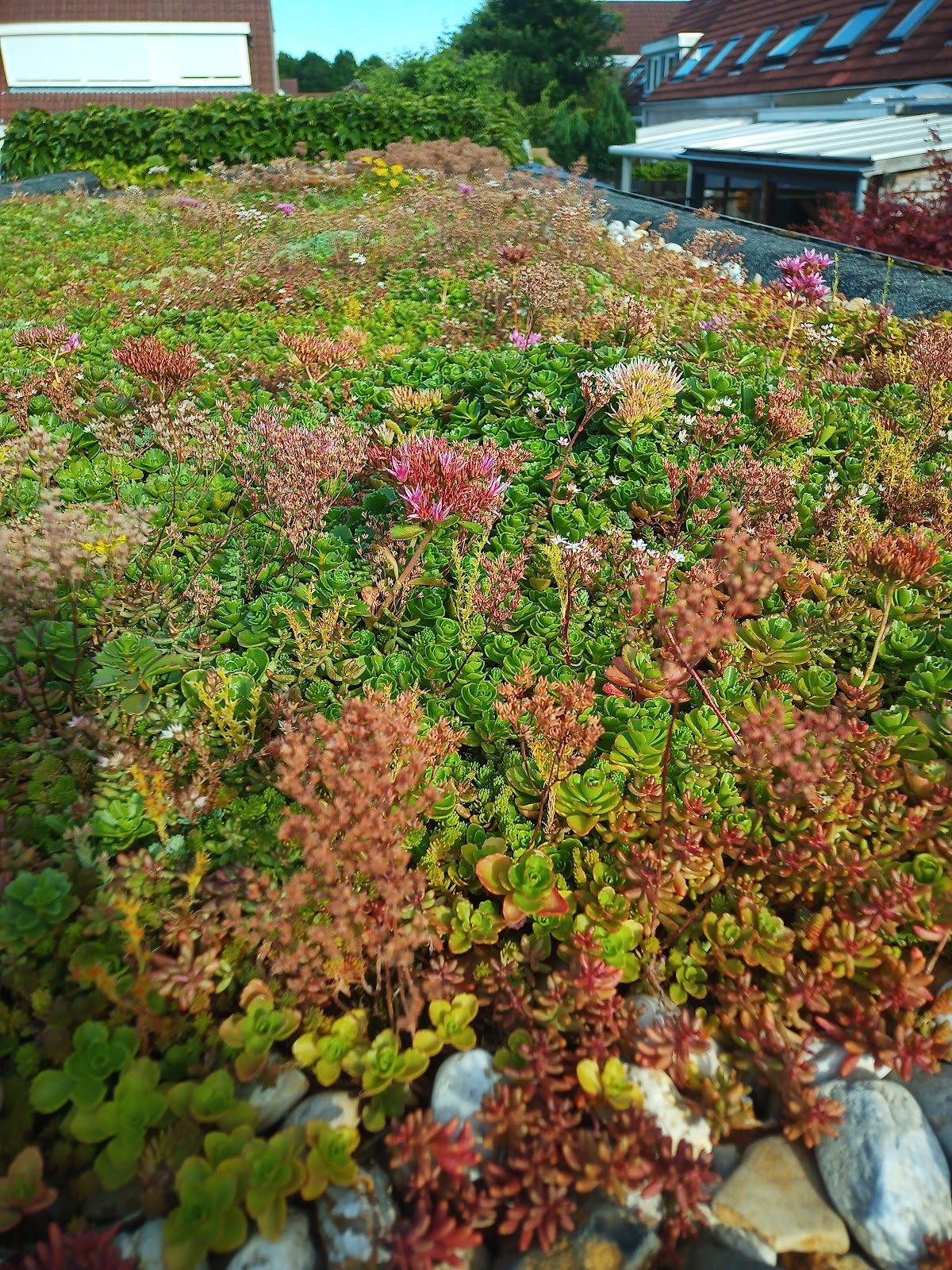 Als je van bovenaf naar de schuurtjes rond de Gipskruidweg kijkt, zie je driemaal een dak dat eruit springt. Groene daken, met een mooie bedekking van planten, vooral sedum (vetplanten). De bewoners hebben gezamenlijk hun dak met groen laten bekleden. “Het is wat duurder,” zegt Andree Troost, “maar dan heb je ook iets moois. En het is vooral duurzaam, want je schuur of etage blijft koel in de zomer en je hebt ook geen last van wateroverlast op het platte dak, omdat het water wordt opgezogen door de planten.”