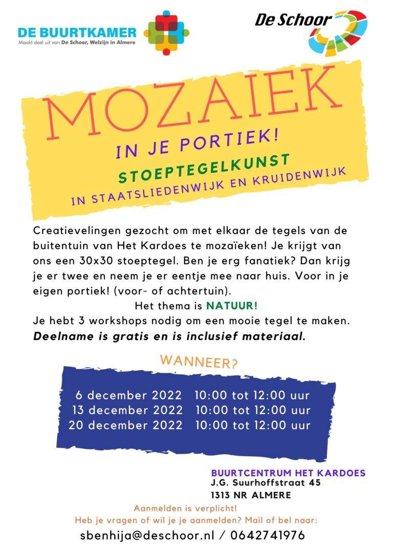 Met ‘Mozaïek in je portiek’ ga je in een serie van drie workshops een stoeptegel mozaïeken om hiermee de buitentuin van buurtcentrum Het Kardoes te verfraaien. Als je wilt, mozaïek je gelijk een stoeptegel voor in je eigen portiek, voor- of achtertuin.
