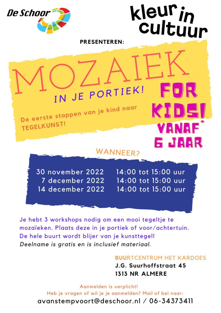 Ook is er een samenwerking aangegaan met Kleur in Cultuur voor de allerkleinste deelnemers. De workshops zijn gratis en worden afwisselend geleid door twee mozaïekkunstenaars.