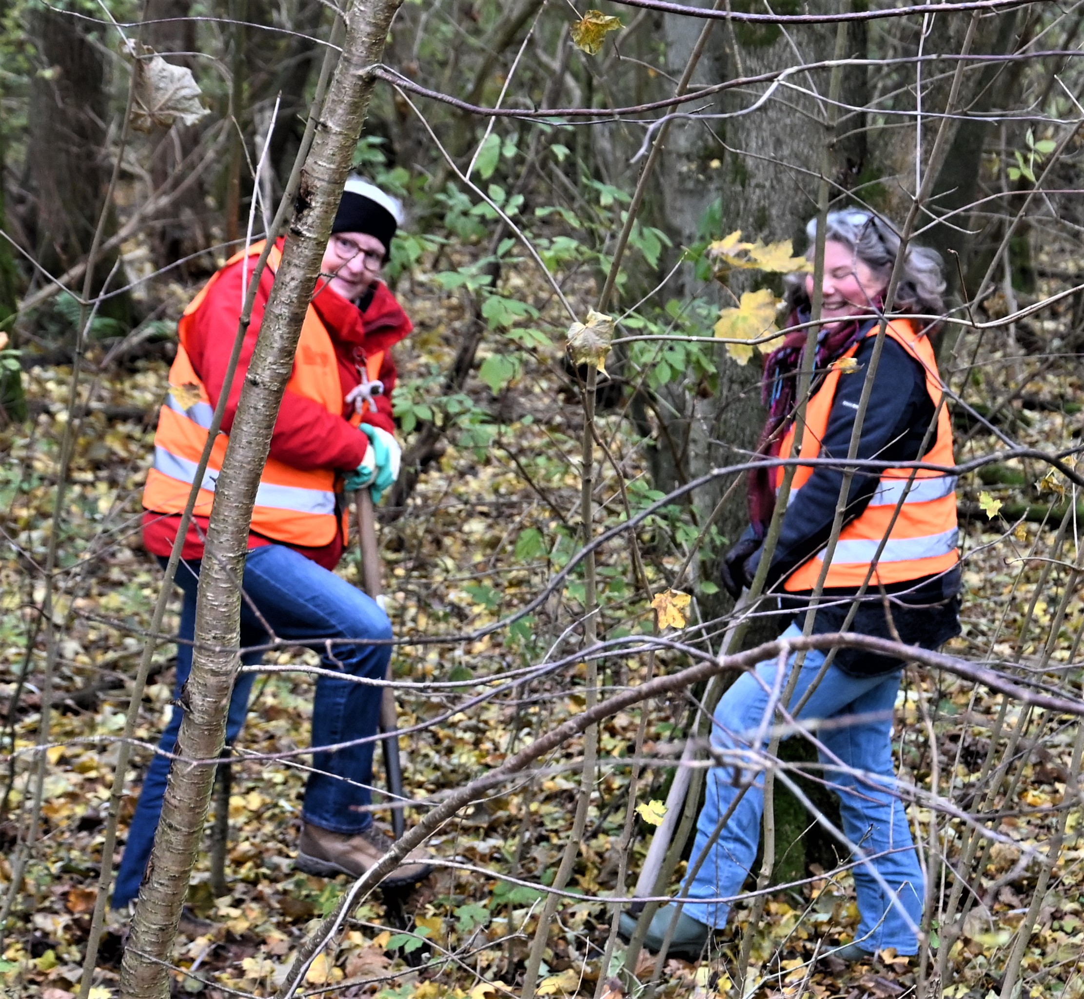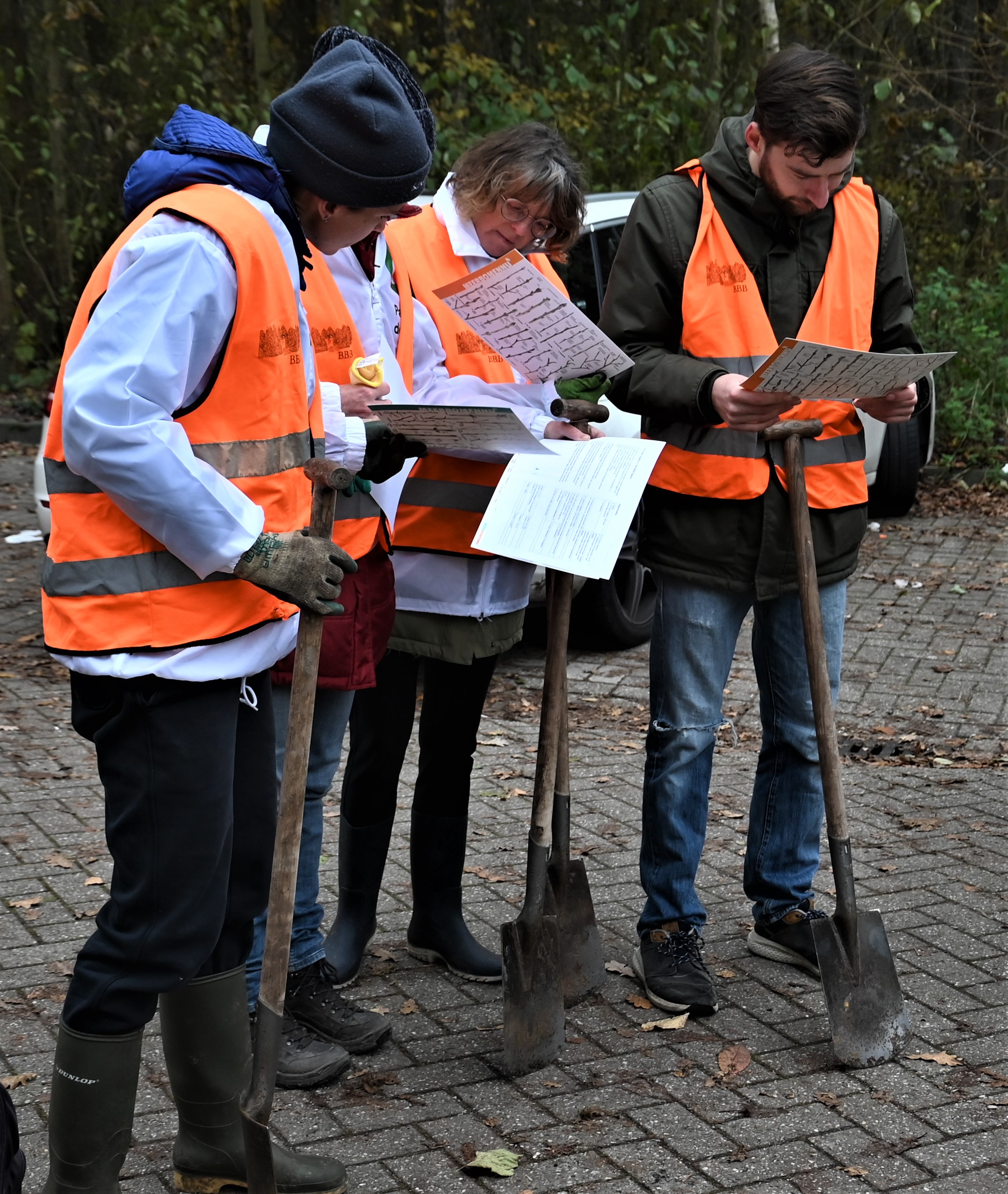 Na het officiële gedeelte geeft Jetze Kamerling, lid van de BBB en ook coördinator van Meer Bomen Nu in Flevoland, een korte uitleg van de werkzaamheden. Ongeveer twintig vrijwilligers gaan in groepjes van twee tot vier mensen aan het werk. Ze gaan jonge boompjes uitgraven die dik genoeg zijn en een lengte tussen de 50 cm en 2 meter hebben, met de wortels er nog aan. Ze trekken het oranje hesje van de BBB aan en met een schep over de schouder vertrekken ze naar verschillende delen van het park. Daar hebben buurtbewoners Rick en Jetze van de BBB het voorwerk al gedaan. Ze hebben de verschillende plekken, waarin zaailingen van een bepaalde soort zijn te vinden, op een kaart aangegeven en in het park met rood-witte strikjes afgezet.