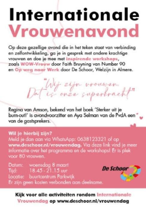 Meld je aan via 06-38123321 of op www.deschoor.nl/vrouwendag.