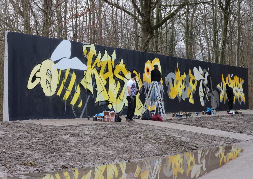 Kasper is er lang mee bezig geweest om de muur te realiseren. In 2022, na corona, kwamen er extra gelden vrij voor jongeren. De skatebaan is opgeknapt, maar het was niet de bedoeling dat de baan weer met graffiti overdekt zou worden. Vanaf die tijd heeft hij zich ingespannen om een graffiti muur naast de skatebaan te realiseren. Dat ging niet zo snel. Verschillende diensten van de gemeente, de welstandscommissie en ook de BBB (de beheergroep van bewoners van het Beatrixpark) hebben zich bemoeid met de plaatsing van de muur. Veiligheid, groen en het zicht op het bos speelden mee in de afwegingen. Uiteindelijk heeft de muur deze plek gekregen, aan het wandelpad aan de andere kant van het fietspad dat dwars door het Beatrixpark gaat.