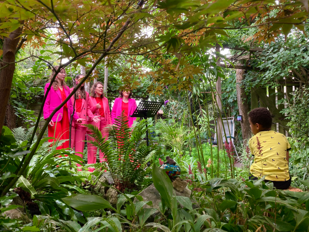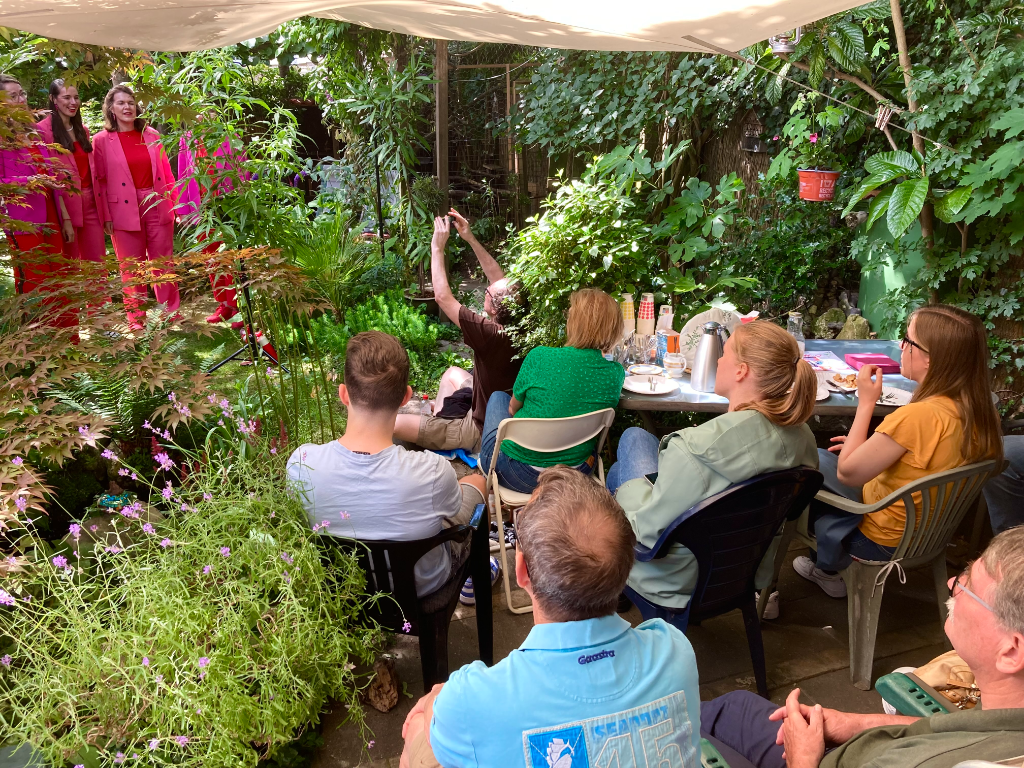 Zo heette ik de 60 bezoekers en de artiesten welkom in mijn tuin in de Kruidenwijk. Zondag 30 juni vond het leukste muziekfestival van Nederland plaats: “Gluren bij de Buren”. Door het hele land openden buurtbewoners hun tuinen voor gratis muzikale optredens, voor het eerst ook in Almere. Met 24 andere Almeerders stelde ik mijn tuin open voor het optreden van het Barbershopkoor MyQ Quartet. De organisatie, in Almere in handen van Poppodium de Meester, had mijn tuin voor hen uitgekozen. A capella zongen ze prachtige liefdesliedjes, swingende nummers en Disney-klassiekers. Ze traden 3x op, zodat de bezoekers ook nog andere tuinconcerten in Almere konden bezoeken. Speciaal voor de kinderen uit ons hofje zongen ze nog een populair Disney-nummer.