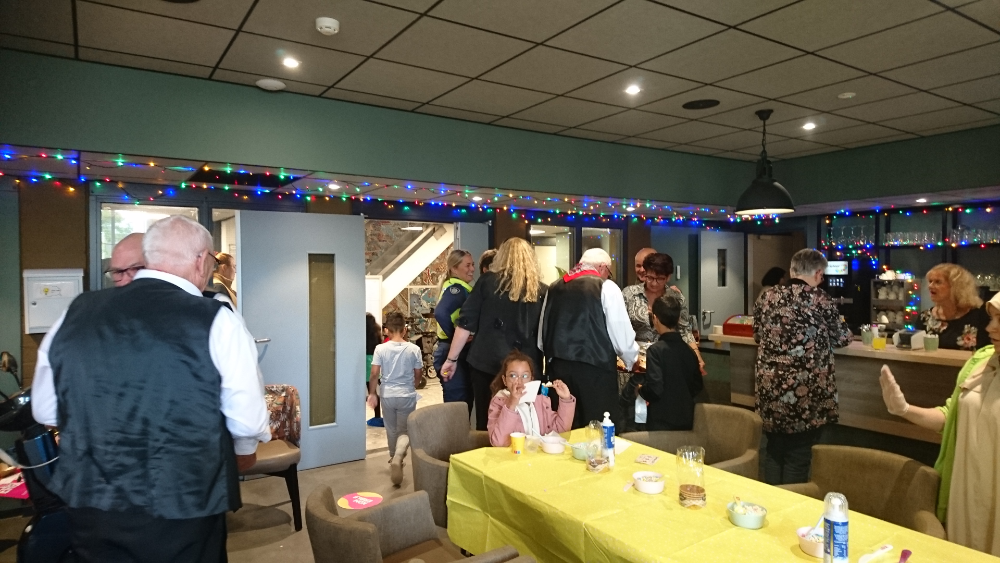 Er komen er steeds meer mensen binnen. Er zijn buurtbewoners en ook cursisten van de Participatiefabriek, die in het Kardoes les hebben en vaak vrijwilligerswerk in de buurt doen. Er zijn ook mensen die Staatsliedenwijk vooral kennen vanuit hun werk, zoals medewerkers van de Schoor en een wijkmanager van woningbouwvereniging Goede Stede. Achter de bar en in de keuken van Kardoes zijn er deze Burendag ook veel vrijwilligers actief. Om een uur of half 1 komen zij vanuit de keuken tevoorschijn met grote schalen met broodjes en bakjes met poffertjes. Genoeg voor iedereen.