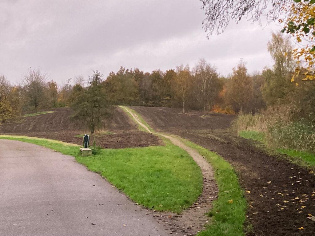 En zoals de foto laat zien, de centrale heuvel is bijna compleet omgeploegd, zodat daar straks een hoeveelheid bloemen gaat staan te schitteren, waar de honden wel pap van lusten. Of hoe zeg je dat. En dat concept is ook toegepast op de kleinere heuvel meer aan de kant van de tennisbanen: die is nu ook bijna helemaal bruin van de modder. Modder die de voedingsbodem vormt waar straks een veld wilde bloemen uit geboren wordt. Modder Earth, zeg maar.