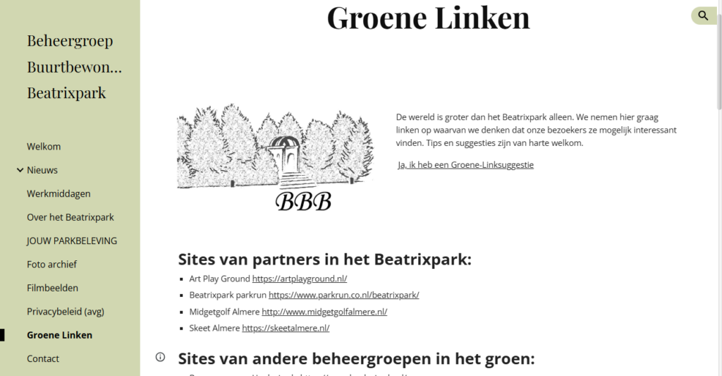 In stukjes die we maken voor de lezers van Kruidenstaat verwijzen wij als Beheergroep Buurtbewoners Beatrixpark steevast naar onze plek op internet. Want wat we ook te melden hebben, dat doen we altijd ook daar. En omdat er wel informatie bijkomt, maar bijna nooit wat verdwijnt, bevat onze webstek intussen een ware schat aan informatie. En tegelijk is het een startpunt naar hele series vergelijkbare websites met ‘groene’ informatie.