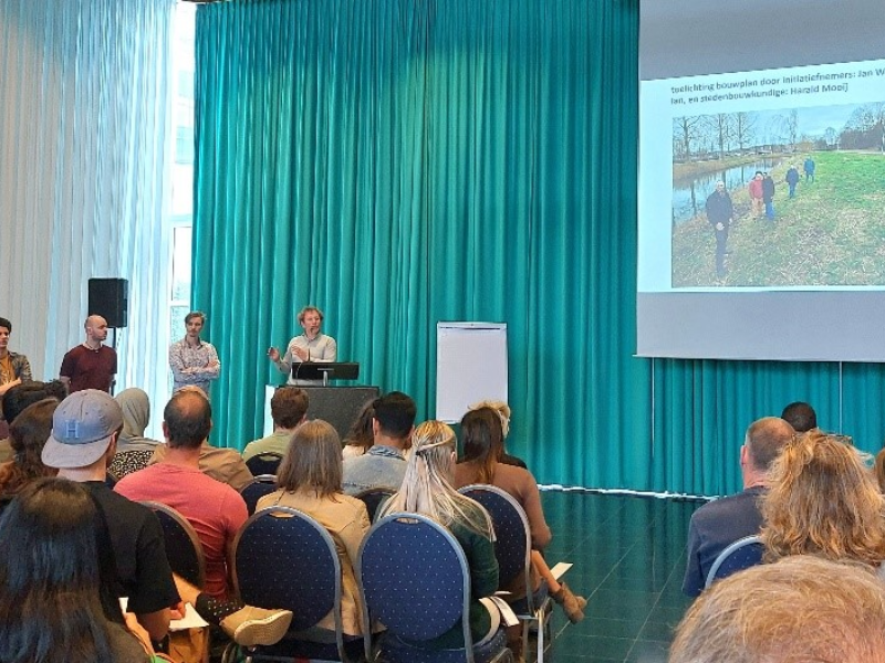 Daarna kwamen de initiatienemers aan het woord met enthousiaste verhalen. Zij hebben immers al een kavel en ook bouwplannen gemaakt. Ze zijn er inmiddels al 4! jaar mee bezig. Een van de vragen was waarom het Gemberpad is gekozen? Het antwoord: “Dat was niet makkelijk. We hebben de hele wijk doorgelopen en hadden 36 locaties. Daarna bleven er drie over. Na overleg met experts zoals de stadsecoloog was dit de enige locatie die aan alle eisen voldeed” aldus een toekomstige bewoner: Niet te dicht op andere bewoners, redelijk eenvoudig te vergroenen want nu is er alleen gras en riet, en aan te sluiten op voorzieningen zoals stadsverwarming. Het is ook een uniek project. De gemeente wil leren van deze pilot en met de resultaten kan het gemeentebestuur besluiten om er vervolg aan te geven.