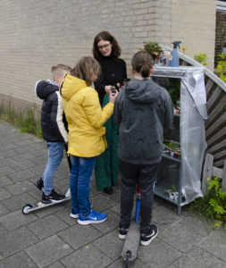 Actie tegel eruit en plant erin Het stormde ’s ochtends op 21 mei 2021, maar dat belette Anita, Mimi, Rick, Margriet, (Groene Buren van de Kruidenwijk) en Patricia niet om